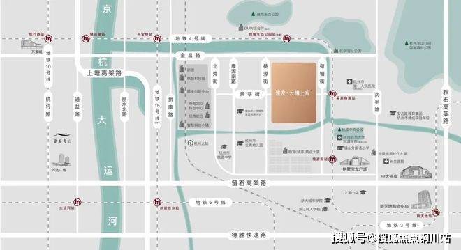 建发云栖上宸坐落于拱墅区桃源板块,占据着得天独厚的地理位置。紧邻地铁 4 号线吴家角港站,仅约 96 米的距离,真正实现了地铁 “0” 距离出行。这不仅为居民提供了极大的交通便利,还能避免地铁下穿带来的震动,比一般意义上的 TOD 更加出色。周边道路网络发达,往东约 2 公里是秋石高架,往南 2 公里出头是留石高架,往西 3 公里多是上塘高架,杭州最重要的主干线都在项目周边,无论是前往未来科技城 - 云城、拥江中心,还是西湖边老城区,都非常便捷。