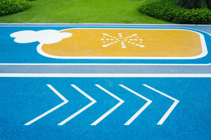 整个健身区的配色很明亮,深浅蓝的锻炼区、暗红色的跑步区,与周边的绿树繁花交相辉映,用相机拍照很容易出片。