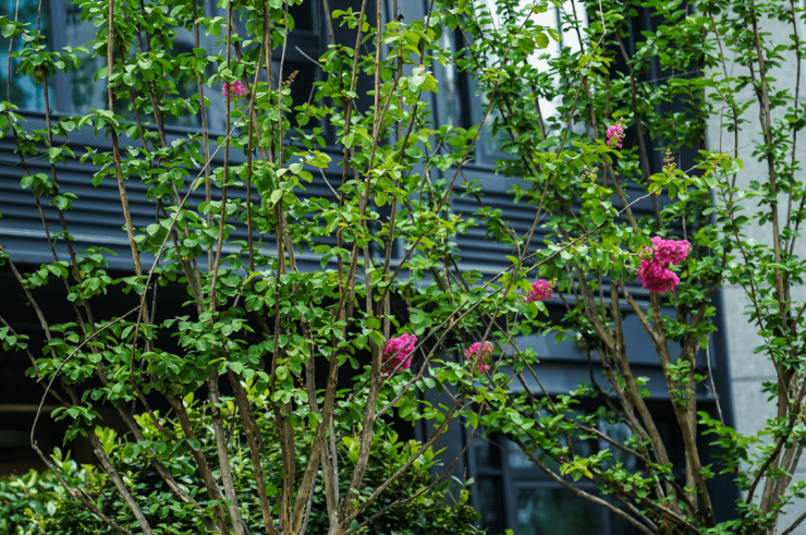 每一栋楼前面都打造了小型的入户花园,单元大门两旁或种植金桂、鸡爪槭,或种植紫薇,营造双倍仪式感。