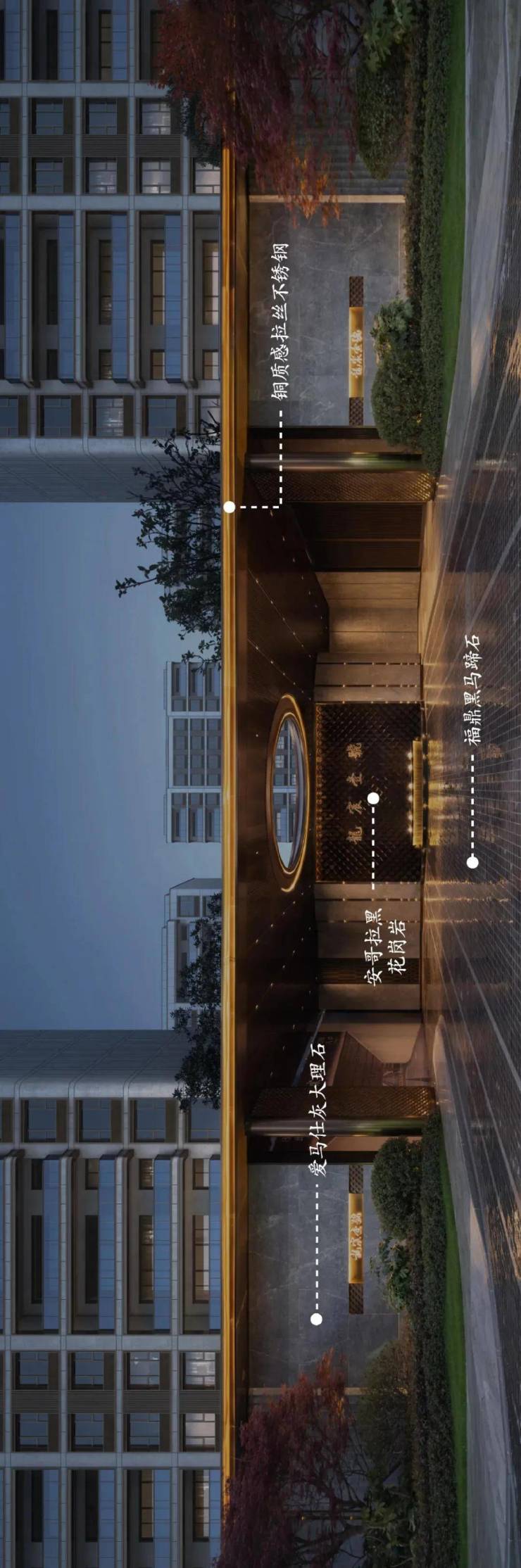 南北对称世家大门,相对而立,气势恢宏,搭配昂贵的爱马仕灰大理石,背景是加入“龙鳞”元素打造成金属龙鳞景墙,古朴、大气、艺术感MAX。