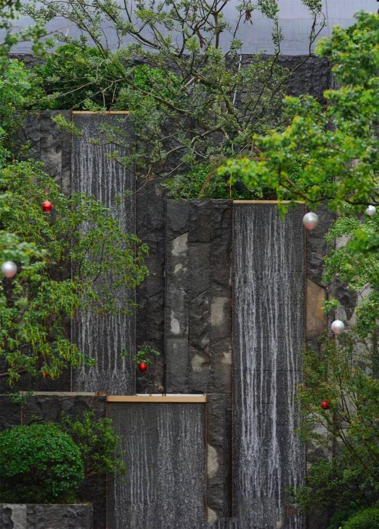 设计师特意走访了福建,浙江,安徽,江苏等地的山区,精选了八棵映山红种植于瀑布叠石中,寓意着长久永恒与尊贵。