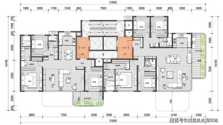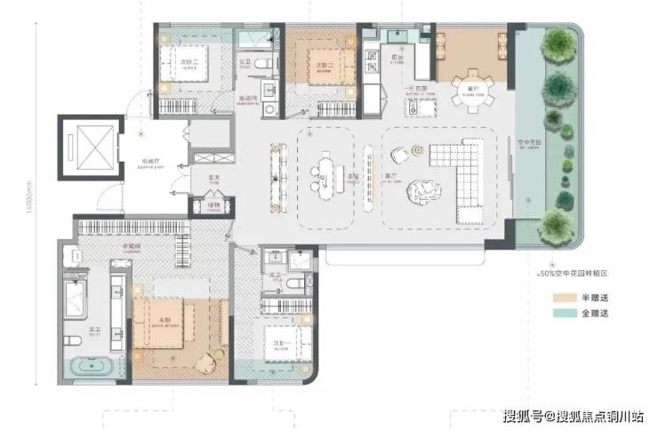 原本2梯2户的设计,巧妙设置电梯与入户位置,变成私梯入户,电梯厅零噪音,拥有独立大尺度泛玄关。电梯厅空间与大花园露台,构成“四代宅”的前厅后院。
