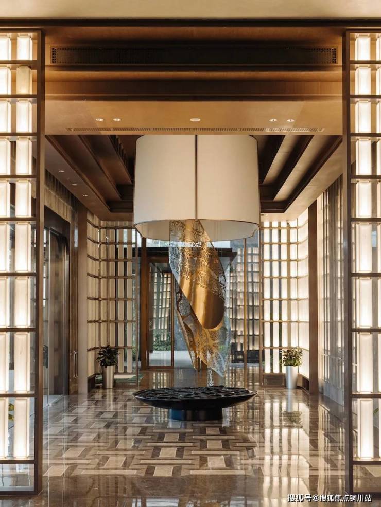 项目的下沉庭院,取意于古汉阳十景,如诗如画,庭院池底是凤凰图腾,楚文化展示长廊、揽月雕塑,延续云梦古泽、高山流水的意境,打造一番山水小天地;样板间的中央空调出风口与室内门面,均采用定制的蛟龙纹。