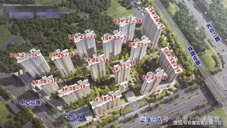整个项目包有二期,首先是一期跟二期的区别。项目临铁路线,最靠近铁路的两栋楼,也就是15、16号楼被规划为二期,楼栋朝向也与一期区别开来,基本为偏东西朝向。