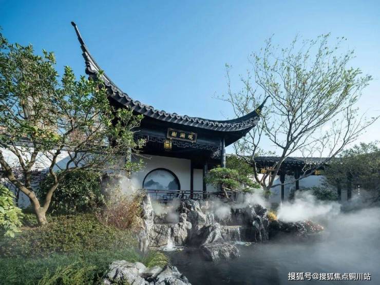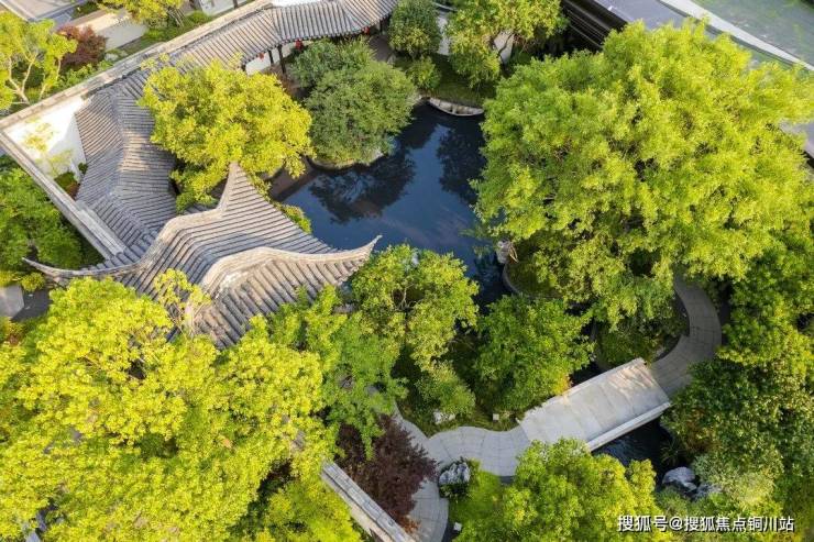 和玺园林师法中国四大名园之一的拙政园,并特邀非遗传承人“香山帮”参与园林的营造,依循门、堂、园的三进脉络,于府门打造恢弘九脊顶乾元门,两侧照壁融入千里江山图卷,并佐以榫卯、华纹点缀;