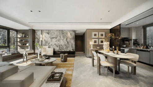 客厅与阳台:该户型采用 LDKG 一体化设计,打造约 5.4 米阔境光景主场,连通约 8.5 米的双联景观大阳台 。宽敞的客厅成为一家人的 “派对空间”,洄游动线设计尽显大宅风范。大面积的 “IMAX 宽屏” 落地窗,细边框搭配整面大玻璃,阳光可肆意洒入室内,室内外空间相互交融,让生活充满阳光与活力。站在阳台上,可将社区美景与城市风光尽收眼底。