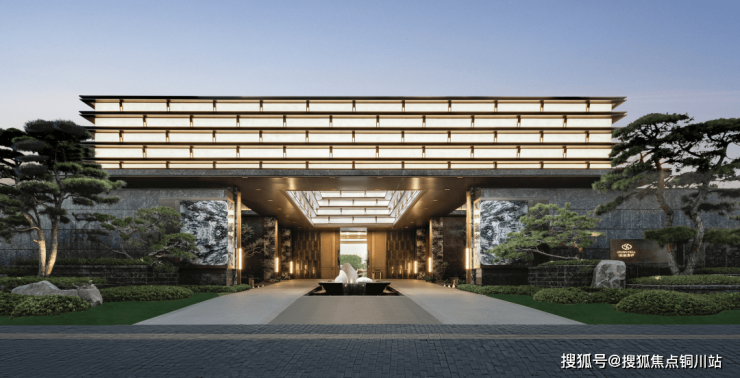 中心华盖之下,是汉白玉整石为主景的叠水,寓意着藏风聚气又纳财;左右两边的华盖下方,则做了诗意的堆坡造景,两棵铁冬青就像展品一样精致。