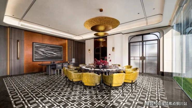 为了实现尊贵雅致的归家仪式感,打造“五境归家”动线,约37米延展面的府院式大门、约4米挑檐星空顶及尊贵酒店式落客和parda绿奢石,勾勒出每一步皆静奢的归家质感。而在入户电梯厅,经典纹样的瓷砖拼花,搭配雪山银狐岩板和精美壁灯,让业主的每次回家都被温馨氛围包裹。