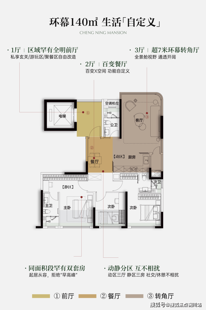 7号楼建面约120-142㎡国广内环改善首创「三房三厅」,创新打造全明前厅、奢阔餐厅、LDKB一体通厅“三厅”设计,打破常规户型规划,为汉口内环家庭重定改善新标准。
