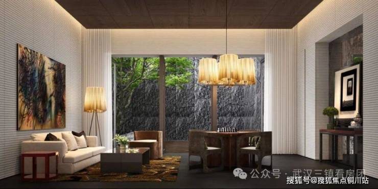 【心流盒子】:整个茶室空间由木材质进行包裹,天花木格栅造型延伸至墙面,打造出立于庭院旁的独特“木质盒子”。推开茶室折叠门,中心庭院的景观一览无余,示范区旖旎风光亦能尽收眼底。