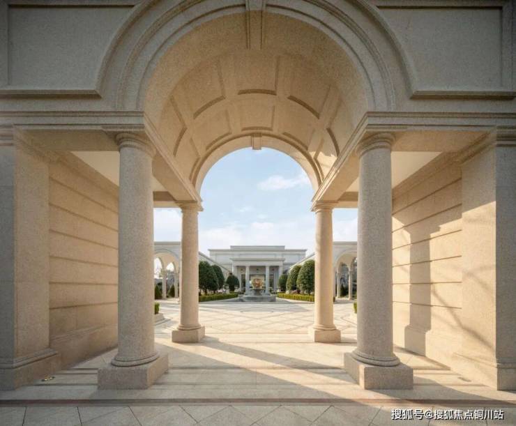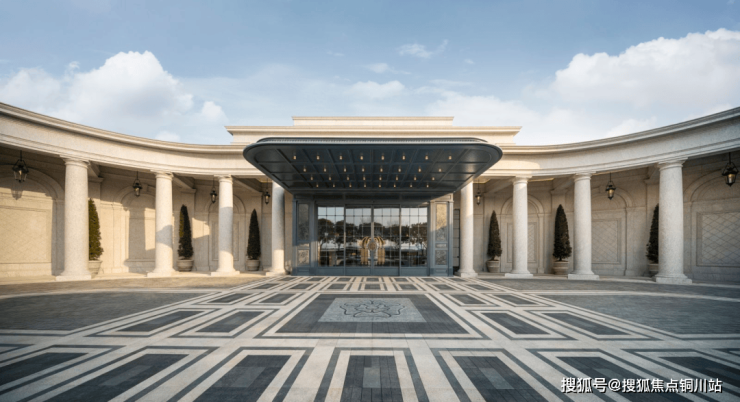 入口的柱廊广场横向尺度近75米,地面铺装巴黎特罗卡德罗广场的格纹图案,数万块10×10厘米的小石材全部人工一块块铺上去。