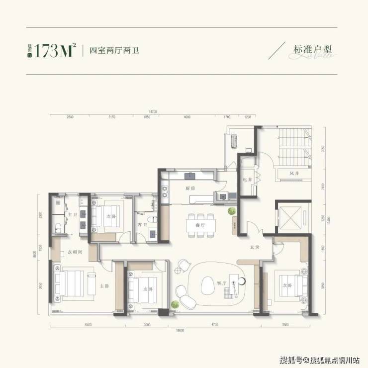 以173㎡户型为例,约18.6米的南向面宽,勾勒出五开间朝南的奢阔格局。
