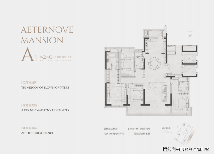 实际使用率约90%、一梯一户独立电梯厅、南向面宽约为16.5米、主卧套房……