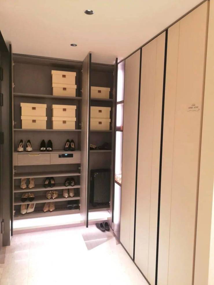 极致收纳。 玄关处,定制了两面墙的收纳玄关柜。玄关柜内配有“灭菌精灵”,能够消杀衣帽鞋子上的细菌。容量方面它可以放60双鞋、20个整理盒、4双高筒靴、4把雨伞、3个手提包、3件大衣。主卧、厨房与卫浴里,收纳空间也做到了极致。