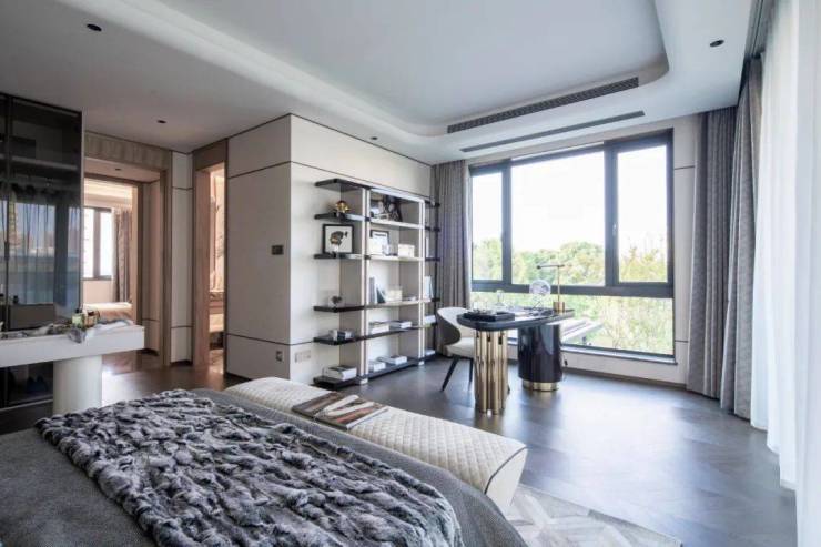 二层主卧套房,奢享约42㎡的室内空间。精致衣帽间搭配梳妆台,构成女主人的专属小天地;大面的落地窗,将室内的视野进行极致放大,推窗见景,让居者每天都在院中美景的召唤中醒来。