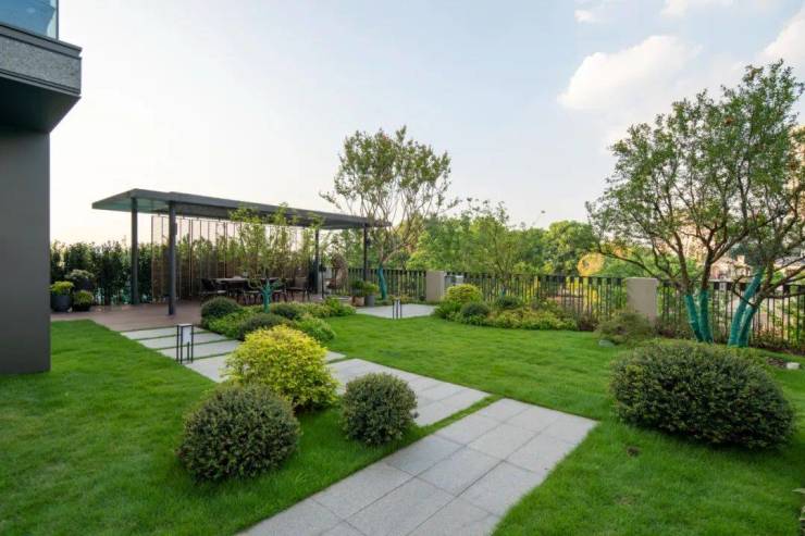 花园入户,门前绿地,约230㎡的庭院,将世间的美好景物皆收藏于此。围合近一亩前庭后院,有天有地有院落;建筑空间与庭院景致自然嵌合,立于庭院中,视野由近及远,树、河、湖逐次展开,收放有度,一切自如。