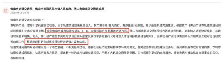 在今年3月也有市民在政府留言板提问“大沥何时有地铁”,官方做出了如下回应。