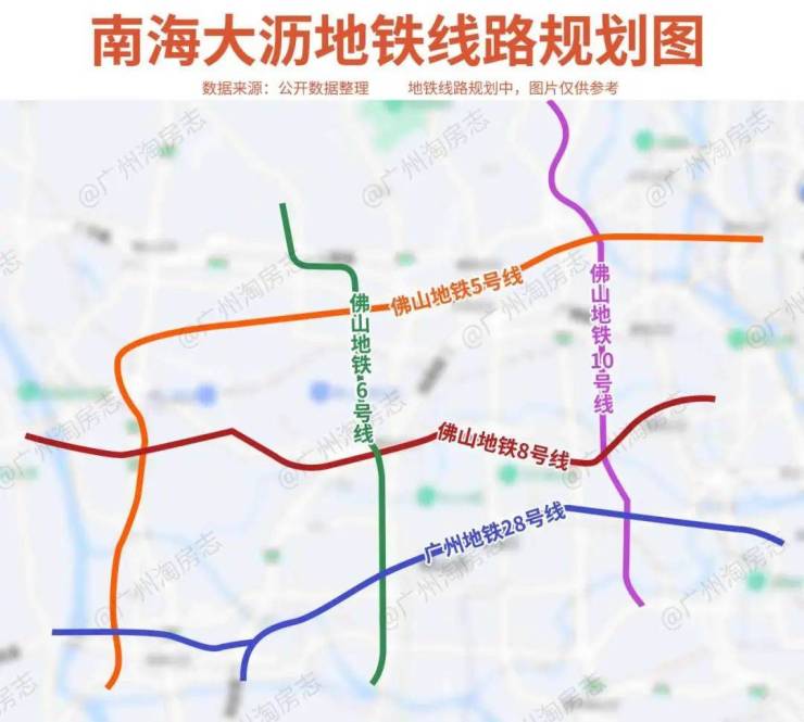 据公开数据,大沥目前规划有6条地铁线路,包括佛山5、6、8、10号线以及广州19、28号线,相当密集。
