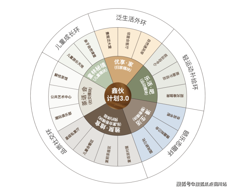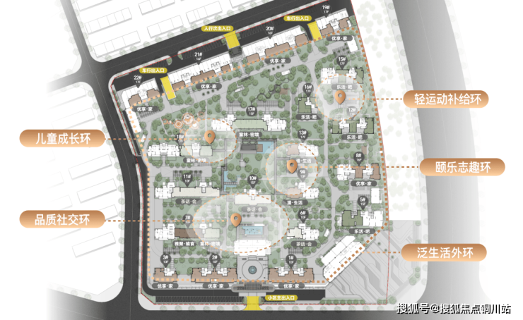 基于“共融、分享、参与、温度”理念,佛堂印象将宅间花园与架空层空间主题化联动,打造了泛生活外环和四“芯”活力环,为业主提供全龄覆盖、风光共生、晴雨无忧的美好社区生活方案: