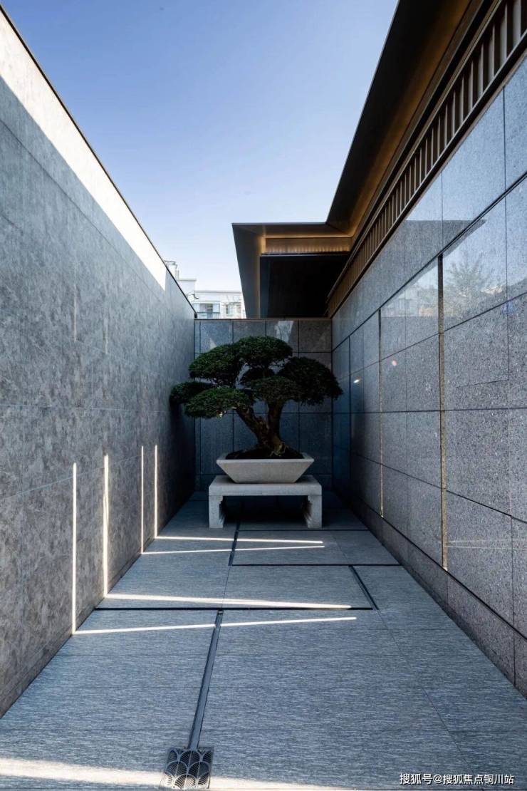 一进水院,所有的建筑落地,傍晚时分的黄昏和清晨耀眼的阳光都会倒影到水面上,百年典藏的松树私藏在这样一个院落里面。