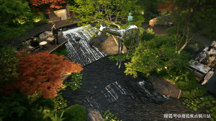 作为“千湖之城”,其历史脉络与人文精神始终与水相融共生,因此景观设计中以“水”为核心叙事线索,将其多元形态转化为可感知的空间语言。通过提取山涧溪流的自然形态,将其抽象演化于艺术构筑、高差处理与雕塑线条之中,形成富有张力的视觉体验。同时,结合东方美学的静雅意境,将水的动态与静态、具象与抽象融于每一处场景。茂密的植被在光影缝隙间自在延展,将都市的喧嚣温柔隔绝。精工金属线条与石材肌理相映,叠级水景调和动静节奏,共同构筑一幅“静而有序、雅呈隐逸大美”的归心画卷。