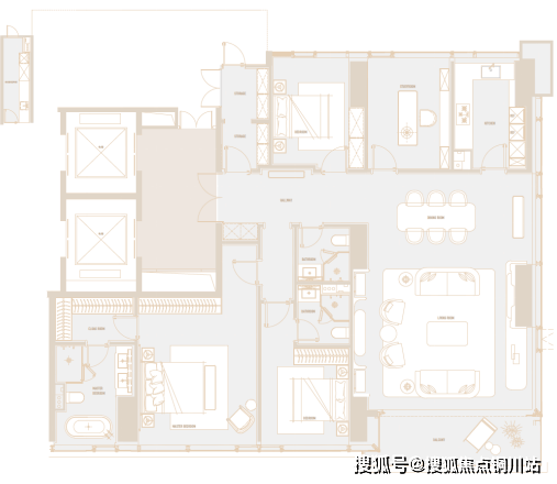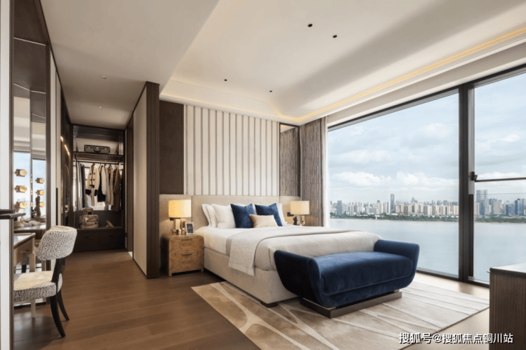280户型融合了海派与法式风格元素。客餐厅利用两面幕墙引入自然光,营造通透的空间感,衔接室内外视野。芬迪白奢石与艺术金属精心打造壁炉造型背景墙,作为法式空间符号,展现了空间的高贵与艺术气息。餐厅采用雅致长桌设计,颠覆传统,为空间增添流动美感,南向主次卧,均以奢华酒店套房为设计蓝本,将法式风格的奢华与舒适融为一体。 在这里,不仅可以享受到优雅和浪漫,还能透过窗户领略到长江大桥的壮丽景色,尽显生活品位和人文气息。