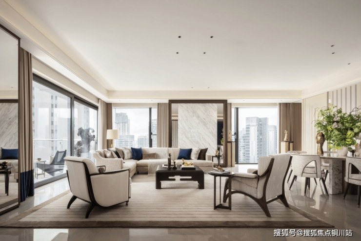 220户型参考酒店式公寓的设计,风格简约而注重细节。幕墙边采用镜面材质以延展景观视野,主背景墙选用白色奢石,地面铺陈浅色天然大理石。墙面搭配烤漆框线与浅色条纹壁布,餐厅辅以胡桃木框线与深色西装面料壁布,并设置镜面迷你吧。窗边设计休闲区域,搭配米色系软装,局部深蓝色单品点缀与硬装相辅相成。