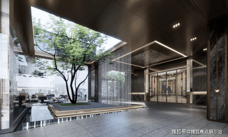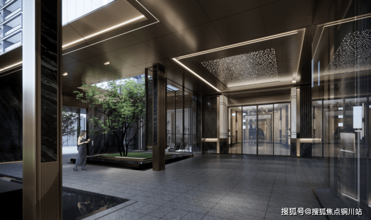 首层单元大堂与风雨连廊的设计手法融合统一,采用仿石砖嵌金属条的形式,在入口电动门两侧设置发光云石灯柱,顶部吊顶设置星光顶,形成场域化的同时增加昭示性。议事厅两侧结合单元入口分别设置了两个小庭院,加之景观水帘、金属网帘的设计为入口和架空层增添更多自由与愉悦。