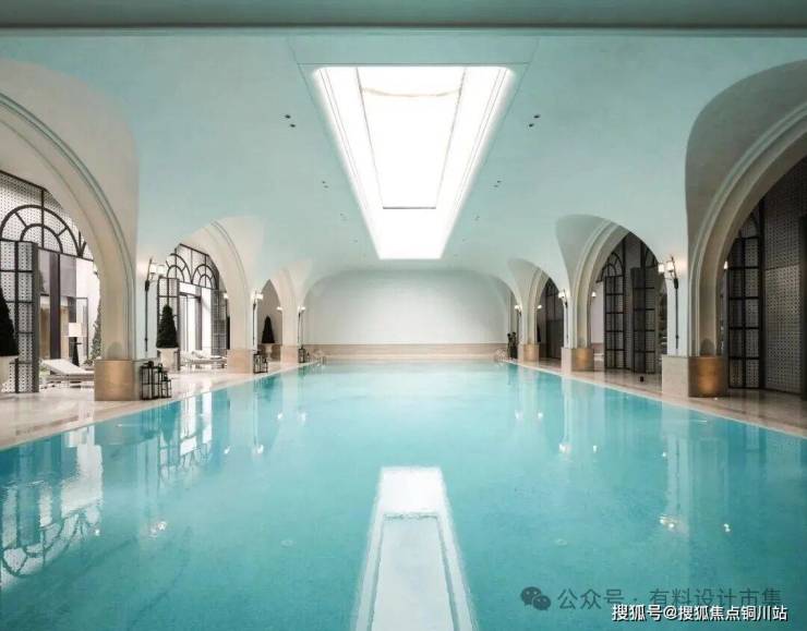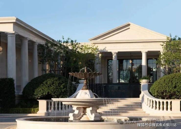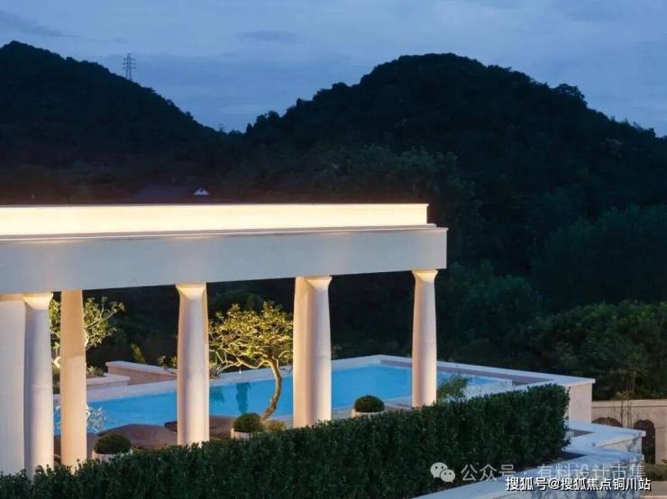 主入口做成了一座更有纵深感的庭院,并将“月恒宫”主楼抬高,由前广场、多层级庭院、翼廊、主楼,共同组成了台地园式的层叠关系。同时设计保持了整体轻松、典雅的特质,通过两侧非对称的翼廊,化解了传统宫廷法式的庄严肃穆。由廊柱围合而成的镜面水池,为地下室内恒温泳池提供了全天候的天光。