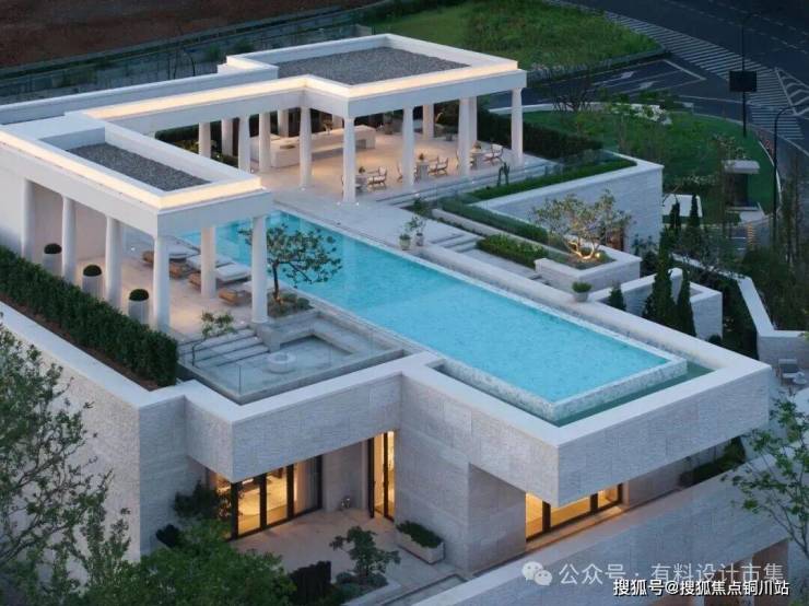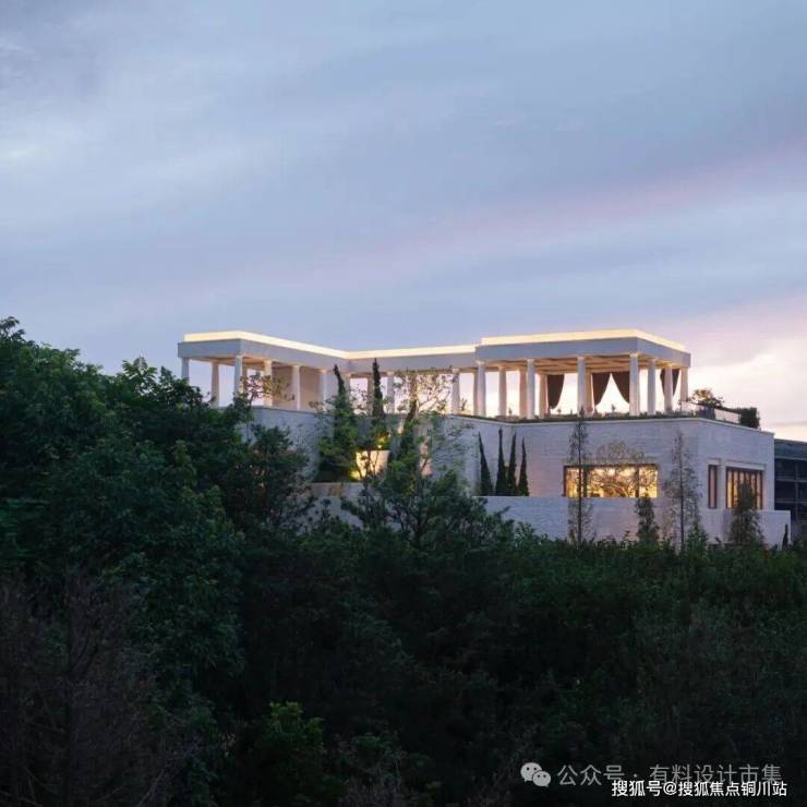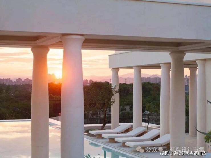 规划设计将盘旋上升的西南角位置,设置为示范区接待会所“日昇台”,这座“城市灯塔”以希腊雅典卫城作为灵感来源,汲取其平坦的屋顶和优雅的廊柱,成为周边山脉最美的框景,同时建立其内外空间的流动性和开放性。顶部局部悬空的景观泳池,增加场所的休闲度假感,其设计的巧妙之处在于水面的视线可延伸至夕阳,当晚霞洒满天空,仿佛置身于天空之境。