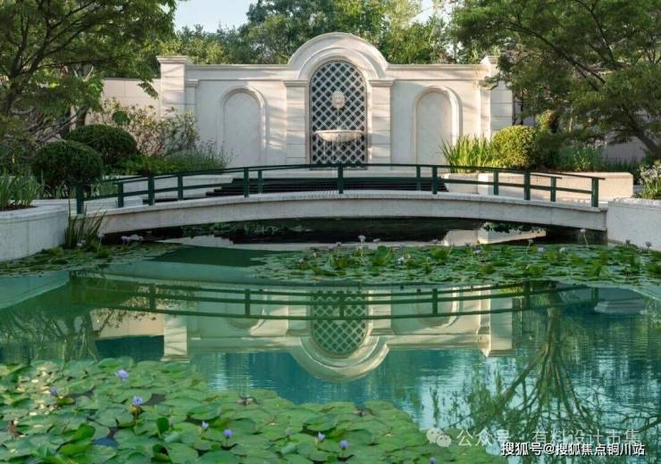 长廊的柱式使用了经典的多立克式,将其简化,保留比例关系,是希腊人对健康、活泼、充满生命力的审美感受的演绎。廊道内侧利用地形布置了具有高低错落的小尺度地台花园,沿街一侧则布置了相对封闭的水景花园,放眼望去,远山、灌木、花丛、睡莲,由远及近,恬趣惬意的氛围令人心情放松下来。