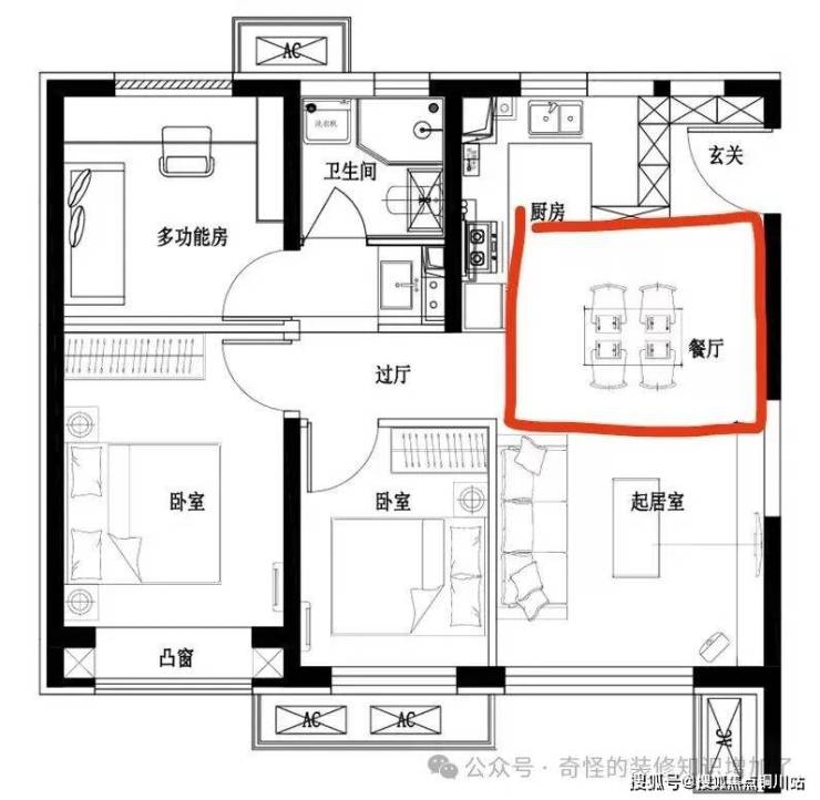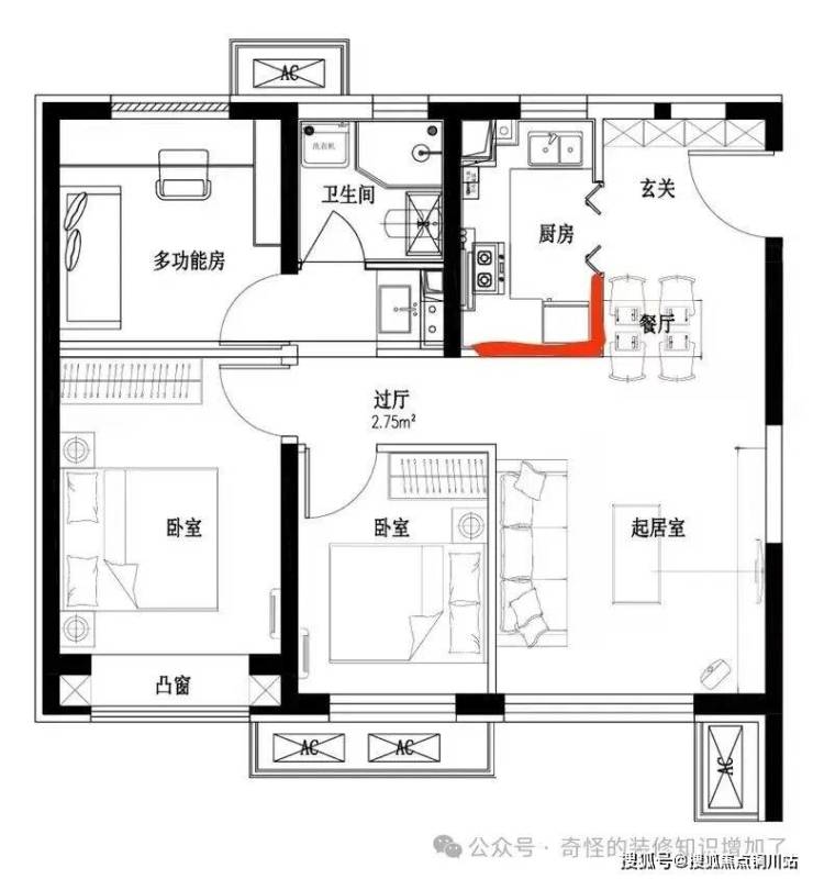 通过这两个图片标红的位置可以很明显的看到。原始结构厨房的墙体非常影响整体的空间。由于原始厨房的墙体导致进门玄关的位置形成了一个无效的走廊通道。我们把原有厨房墙体拆掉之后会让整个客餐厨的空间变为有效的三个功能区。这样就可以有效的释放出一部分空间给到餐区。