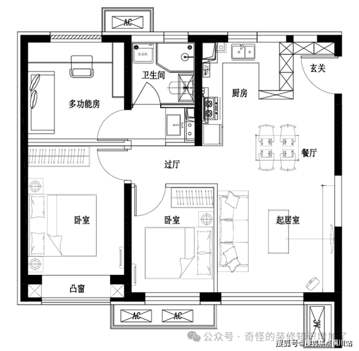 方案一:这一稿方案,主要是遵循原始户型,在原始户型的基础上做布局,不同的需求不同的布局,原始户型是绝大多数业主都可以接受的。从原始平面布局图上可以看到。整体空间的格局比较方正。卧室的位置比较明确。但比较明显的地方是餐厅没有一个相对独立的区域。如果说有些业主朋友对风水有一定要求的话,进门正对厨房其实也应该在后期的方案设计中有所调整。所以结合现有的情况我们主要需要先解决餐厅的位置。