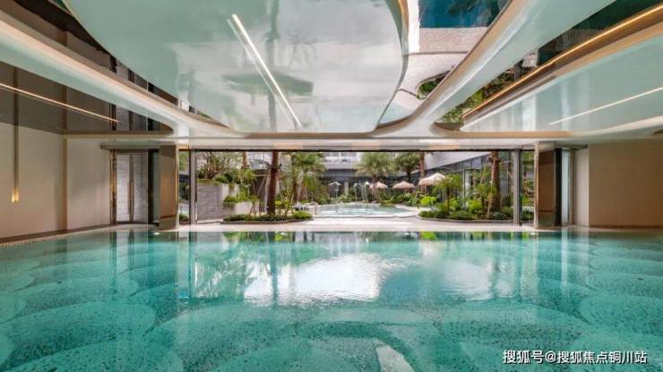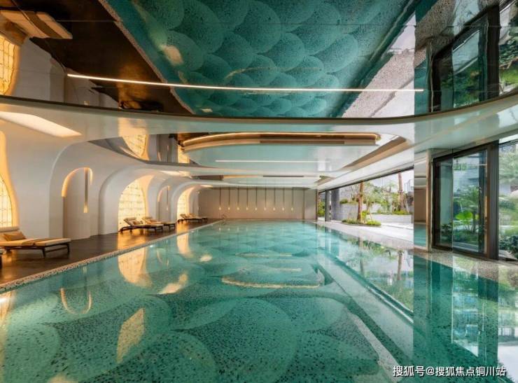 沿着景观轴线漫步深入,水景与建筑悄然交融,从户外的水天一色,到室内的雅奢静谧,内外泳池有机衔接 ,巨大的玻璃幕墙更将室外园景无缝引入室内,形成无界水域的视觉感受。