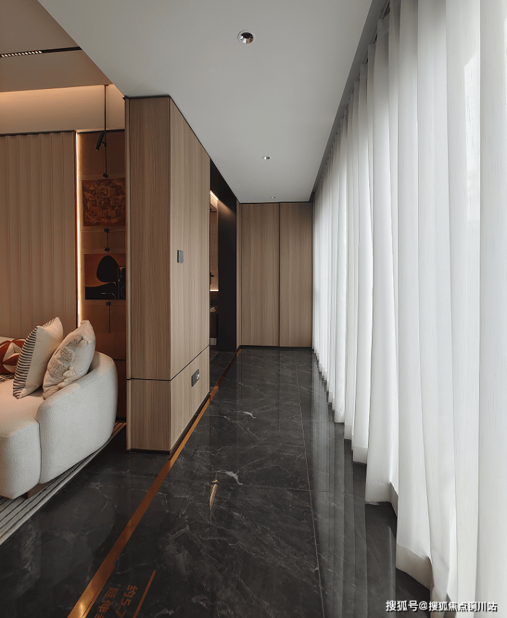 这小小的变动对于购房者来说用处却是极大的:如释放室内空间,后期嵌入双开门冰箱、餐边柜等不会显得突兀,和墙壁拉平,可兼顾收纳功能与动线美观。