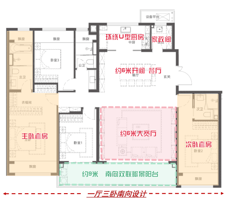 ●南向宽景阳台负责舒适休闲,北侧家政间负责生活功能,分工明确;