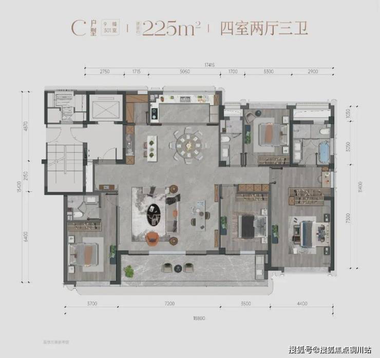 建面约225㎡户型:不仅是“超尺度”,更是“自由度”。