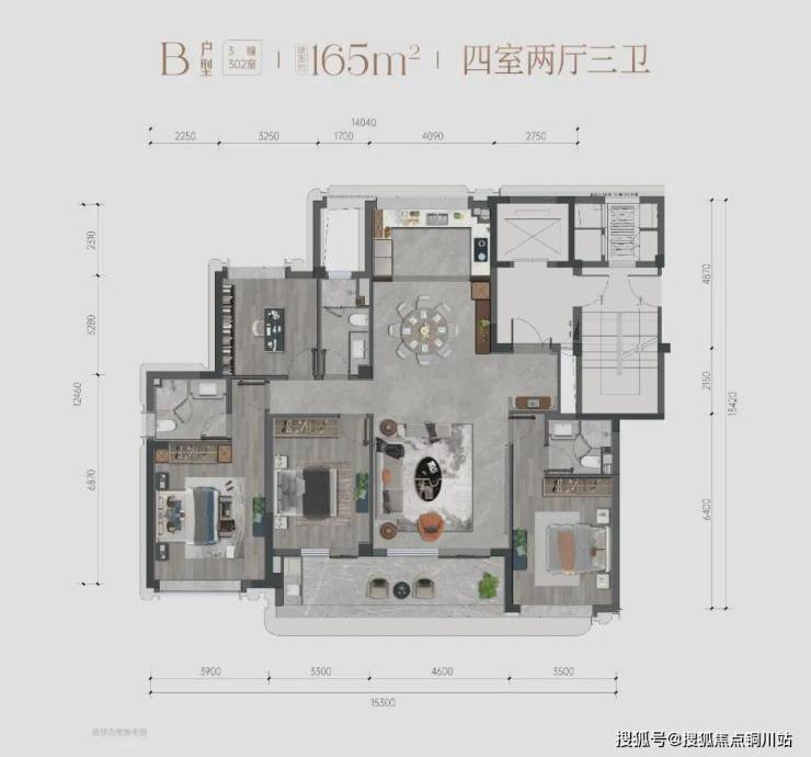 均好性与空间平权。最小户型165㎡的最小房间开间也有约3.25米,得益于进深尺度,收纳空间非常出彩。房间尺度的黄金比例,没有所谓的小房间,做到真正舒适,生活游刃有余。