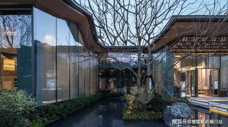 景庭院中,皆三面玻璃围合,一处庭中灌木起伏,探踪求索,直达溪边;另一处水光相应,人景物倒映在水面上,竟有置身幽静之感,心绪回归宁泊。追思忆想,正如诗中写道的“非宁静无以致远”。