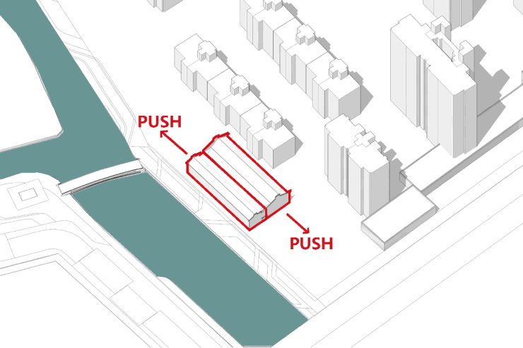 秉承骆驼桥千年文化底蕴,设计师以桥、水、岸、榭四种水乡典型特征,取之生成曲折回廊的布局;通过体块的错落,形成建筑的立面肖像;再提取宁波特有的屋面形式,运用于建筑之中。