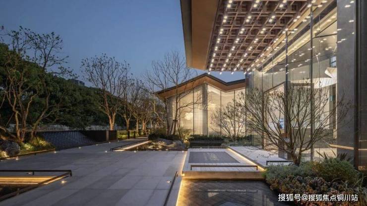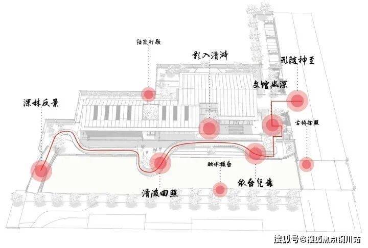 示范区掩映在浓荫之中,与森森绿意相映成趣。中式硬朗的线条与自然生长的建筑相得益彰,耳边环绕潺潺流水,在光影声乐交织下,引人入胜。勾起访客探幽溯源之情,不禁踏入一方静谧之境,开启了溯源之旅。
