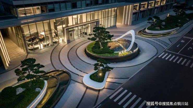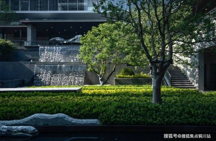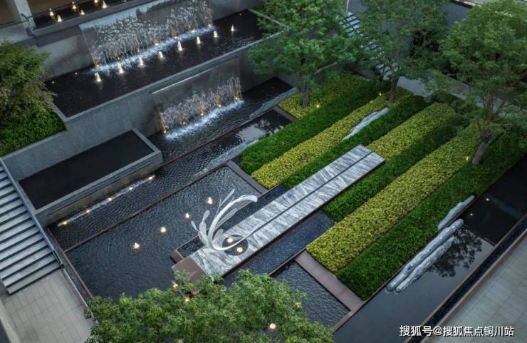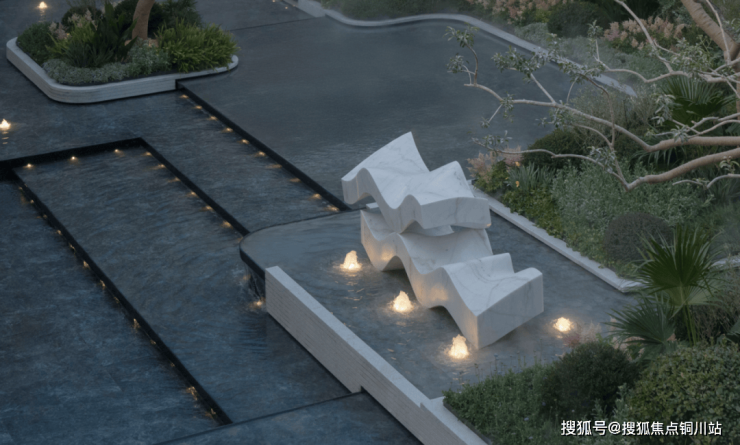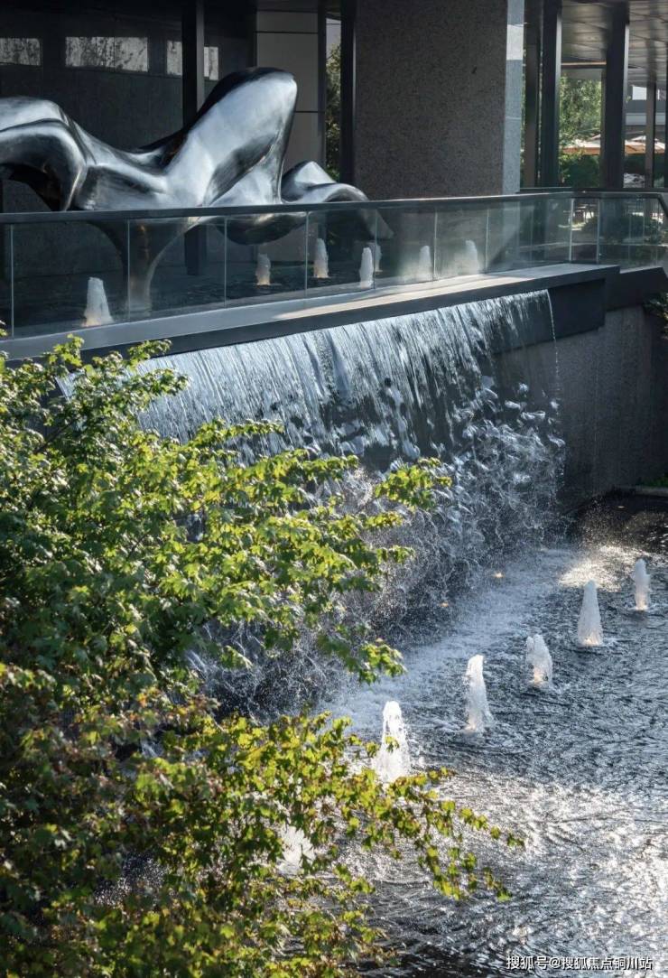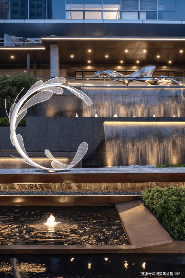 沿两侧台阶拾级而下,绿意萦绕的带状水景在眼前铺展。中央的水台倒映天光,与端部凌空舒展的流线形雕塑遥相呼应,金属材质在光影中流转诗意。