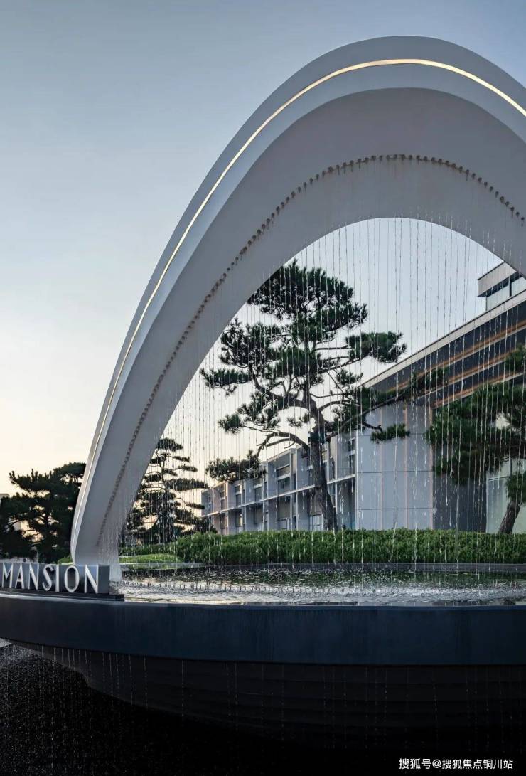 中部设计高耸、飘逸的水景雕塑,搭配圆形的跌水水景,悬浮的水幕落下,坠入大海。从侧面望去,如一叶扁舟缓缓驶来,诉说着“古海上丝绸之路”的繁华故事。