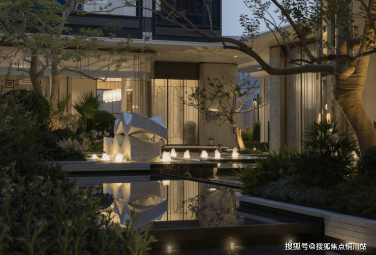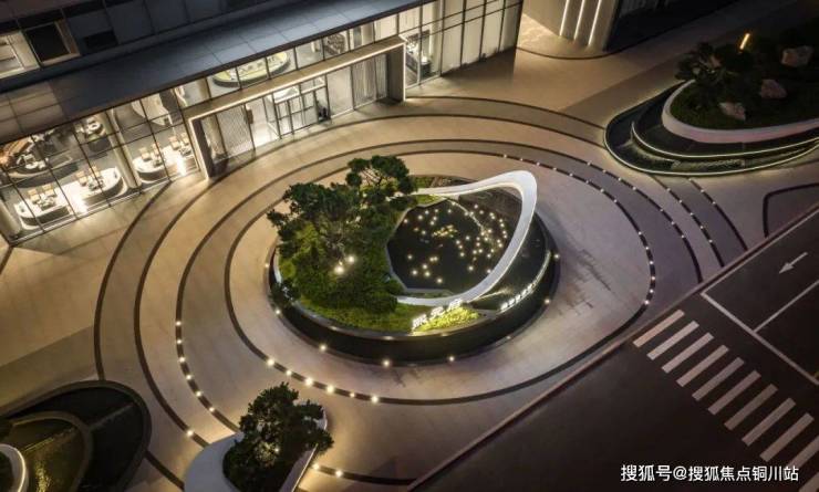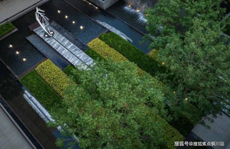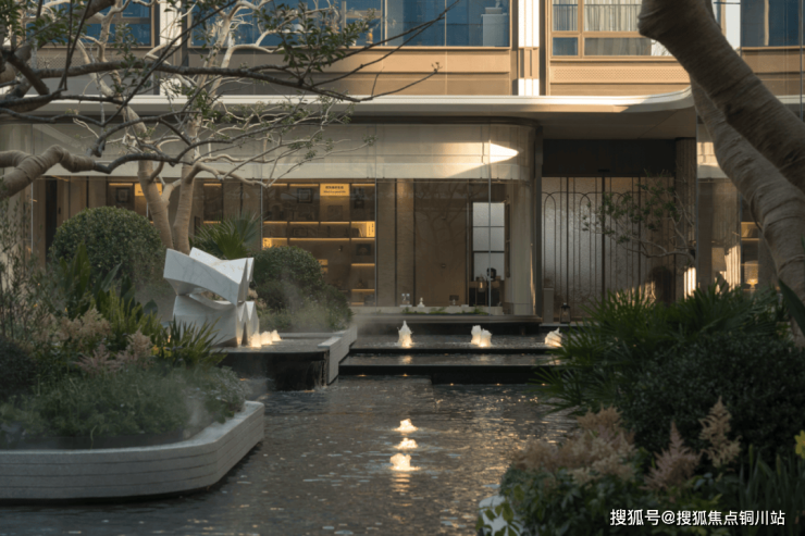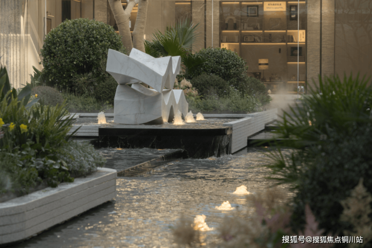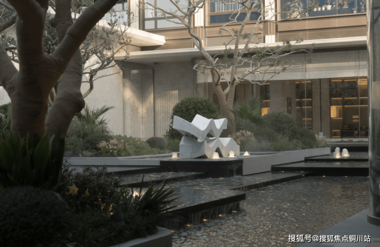 下沉水庭,沿北入口进入,对景设计水景涌泉搭配雕塑,增强仪式感的同时,也起到障景作用。水景缓缓流至下沉水庭,将上下两个空间联系在一起。