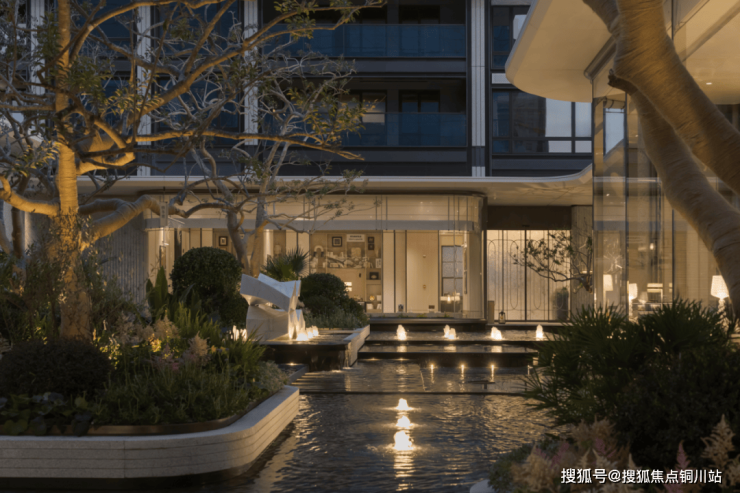 水苑每一处细节都经过精心设计,无论是水面上轻轻漂浮的睡莲,还是美国白金花岗岩包裹的自然绿植,还是水面之下映射的翡翠蓝铺装,都恰到好处地点缀着这片天地。