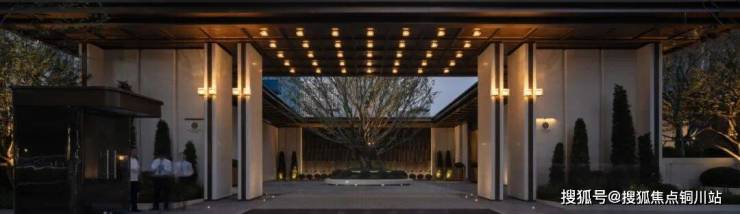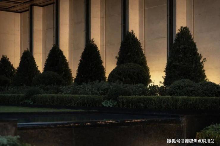 府邸门前以对称的轴线从容铺展,将古典秩序悄然复刻于当代场景。大门两侧景墙勾勒出沉稳的界面关系,在秩序与灵动之间,以东韵西境的融合,诠释诗意美学的完美交融。