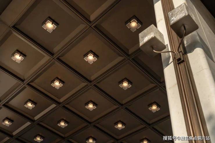 转折处,我们雕琢了一方城市的艺术端景。优雅的竖向柱式与实体墙体,构成了严谨的序列节奏,精致的线性壁灯在日暮时分亮起,投射出温暖的光晕。序列之中,整面贝金米黄石材异形加工,雕琢出柔美的弧形艺术墙面。