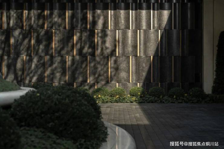 车马院于古树之下,一棵80年全冠朴树苍劲而立,是守望与归属的期盼。端景以整块安哥拉黑石材雕琢的造型景墙,墙面以纤细金属线条勾勒几何缝隙,于厚重质感中透出精工雅奢。光影掠过的墙面,与浮雕的凹凸质感共舞形成瞬息万变的画卷,诉说着关于品味与宁静。