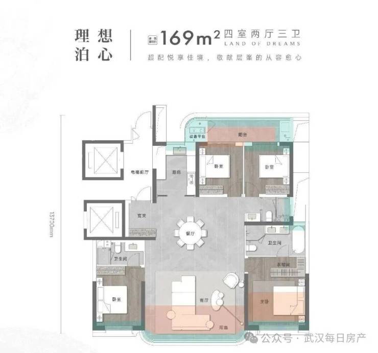 建面约169平是四房两厅三卫双主卧套房: