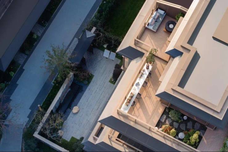 合院叠墅采用退台式设计,在高楼密集的城市中心,创造“空中庭院”,使每一层都获得前向无遮挡的视野通廊,将城市景观转化为私有化“视觉资产”。搭配L型露台的设计,更是将房子变为城市风云变幻的IMAX影厅。